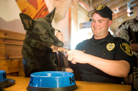 Nero, a Gloucester Township police dog who captured a burglary suspect, enjoys a reward dinner at Texas Roadhouse with his handler, Patrolman James Clark.